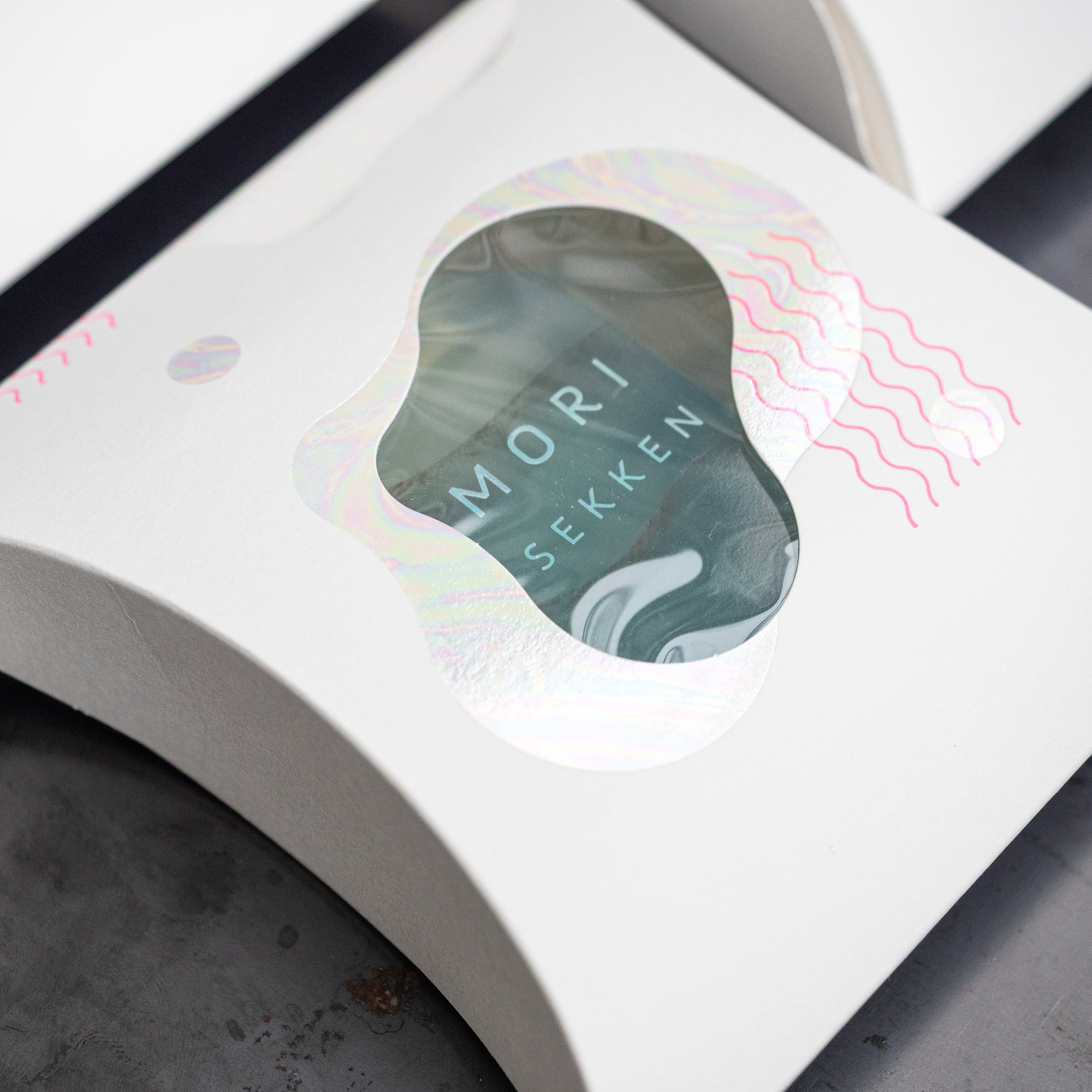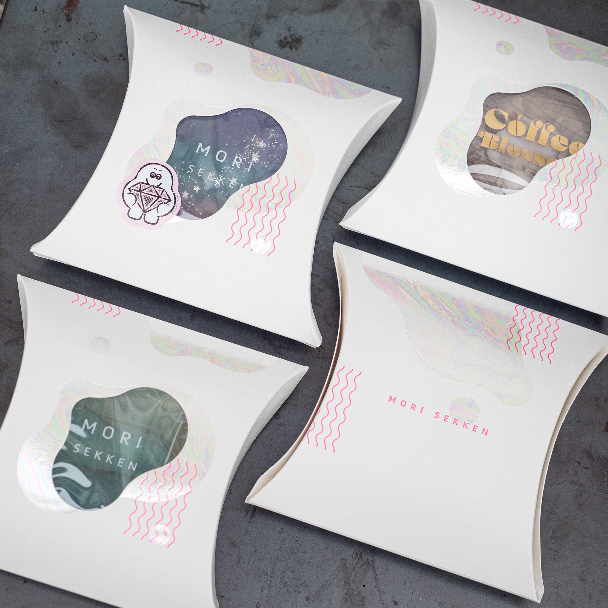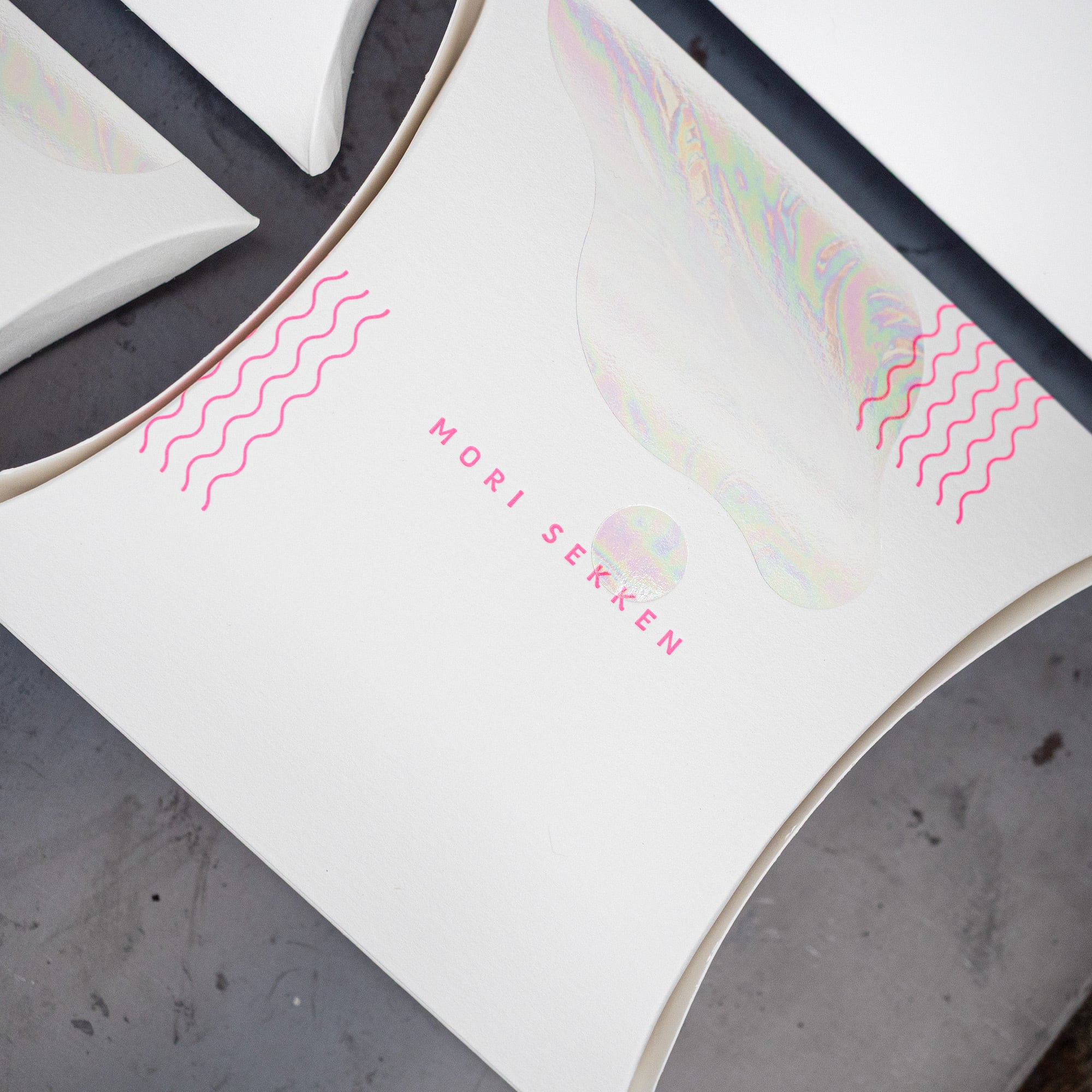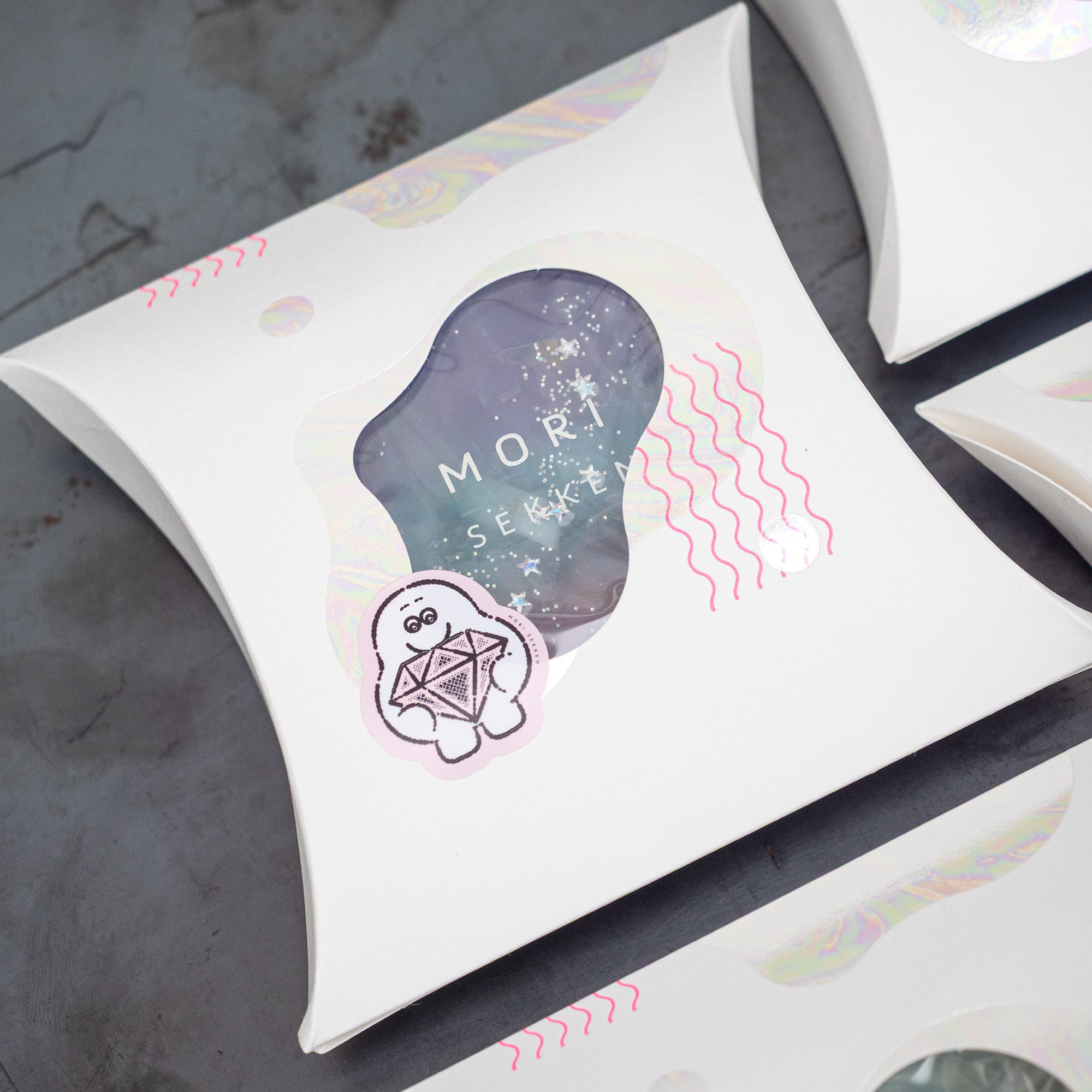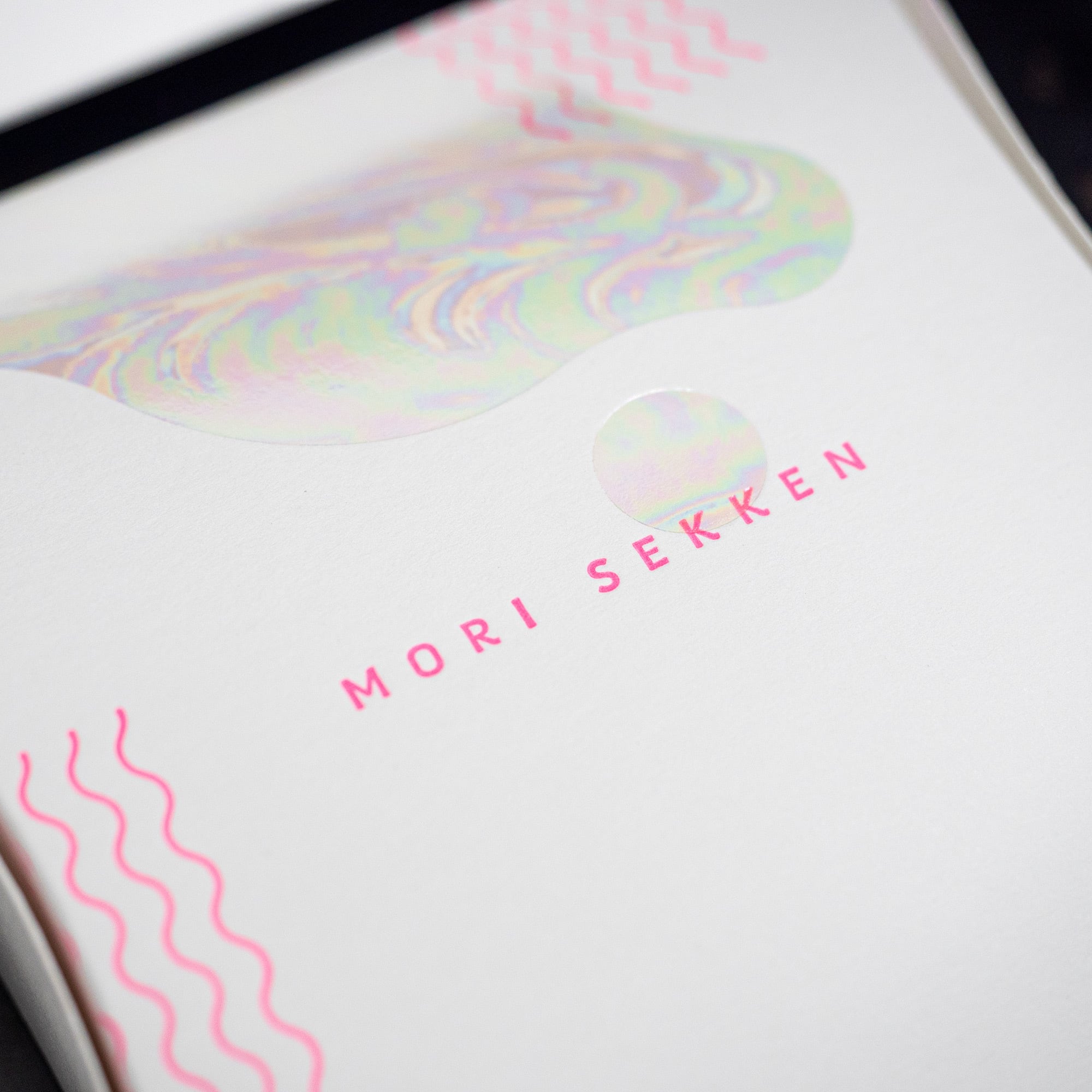蛍光ピンクの元気な箔押しと、一つ一つ柄が違う透明なプリズム箔がかわいい